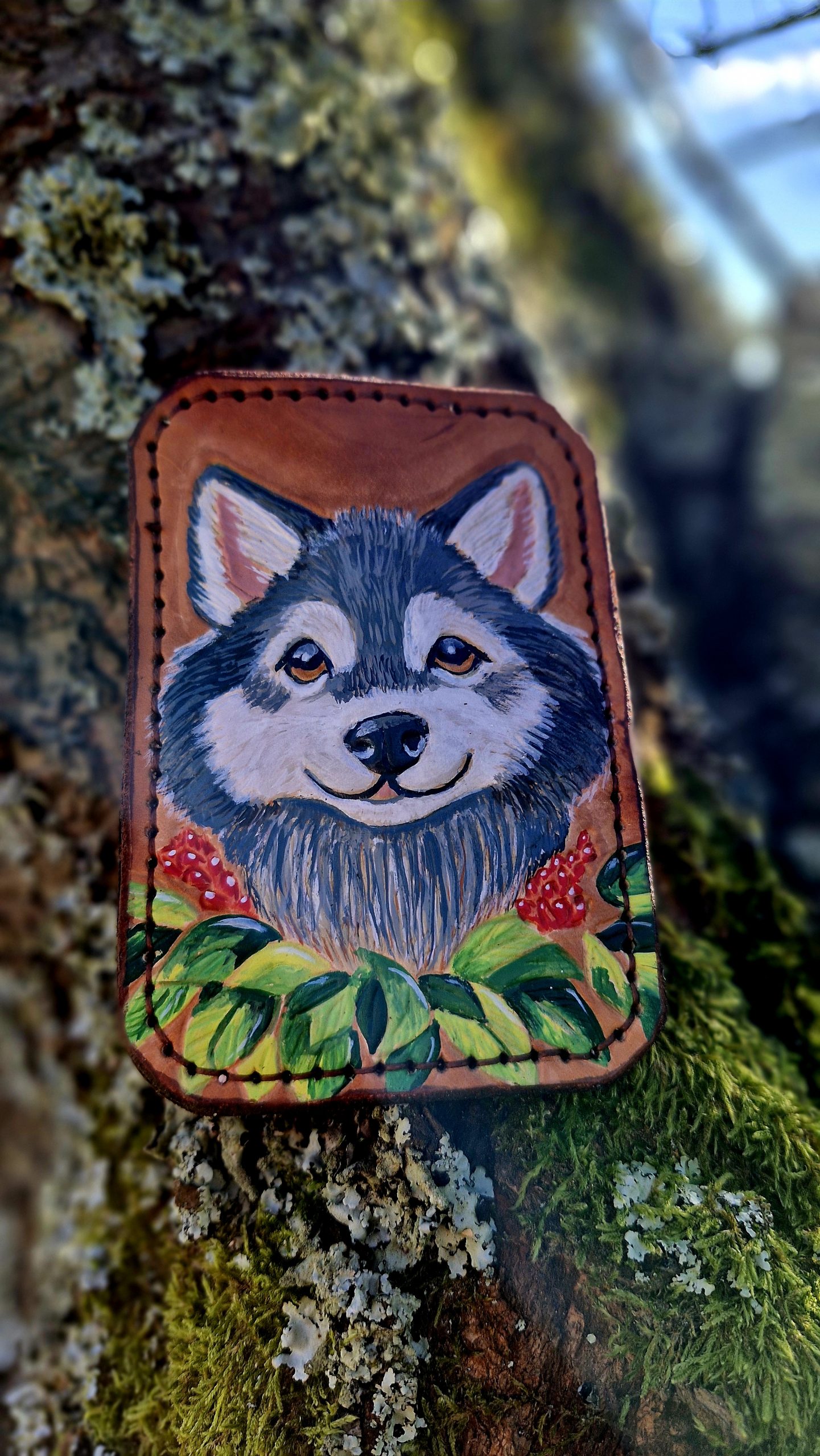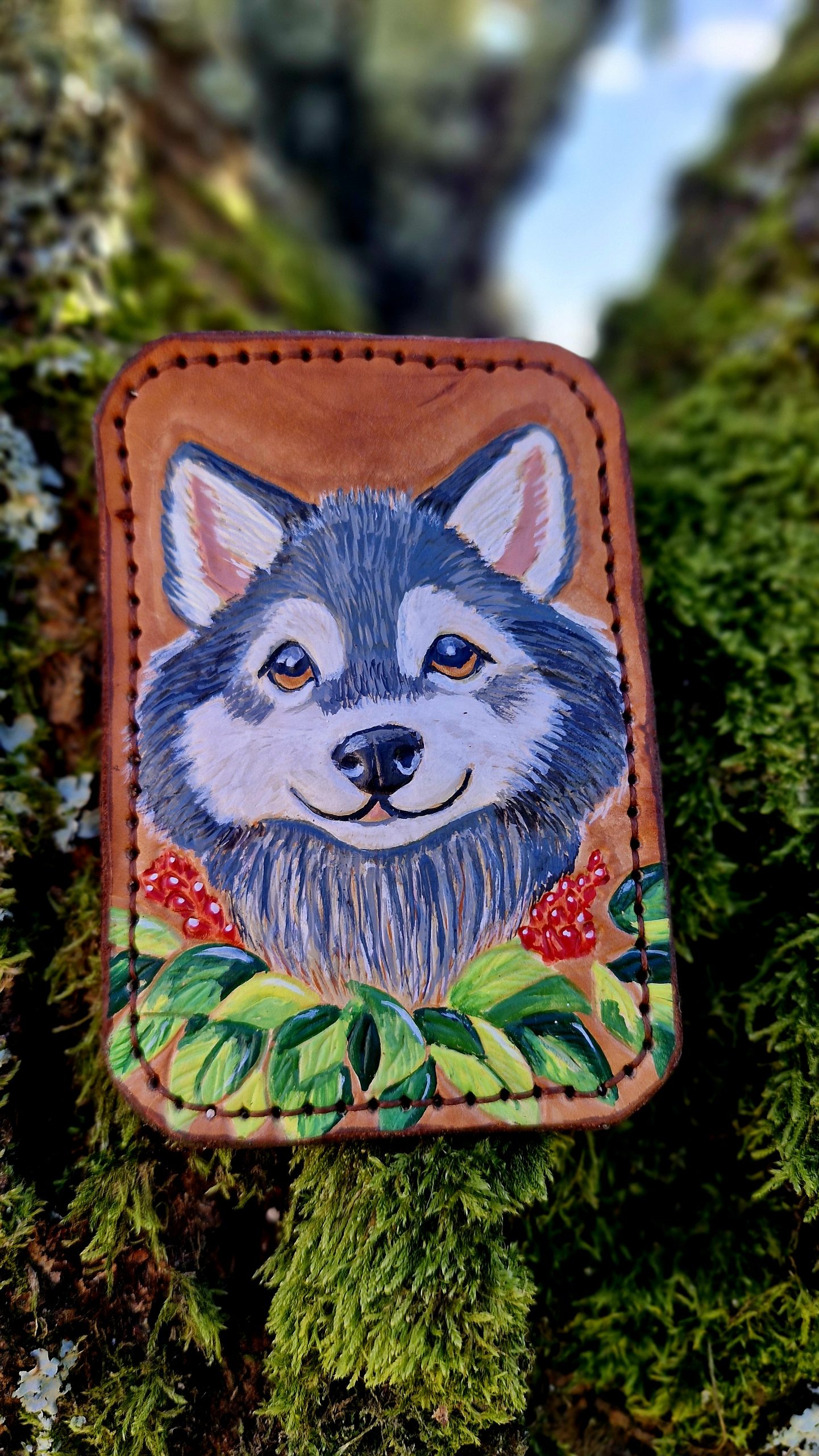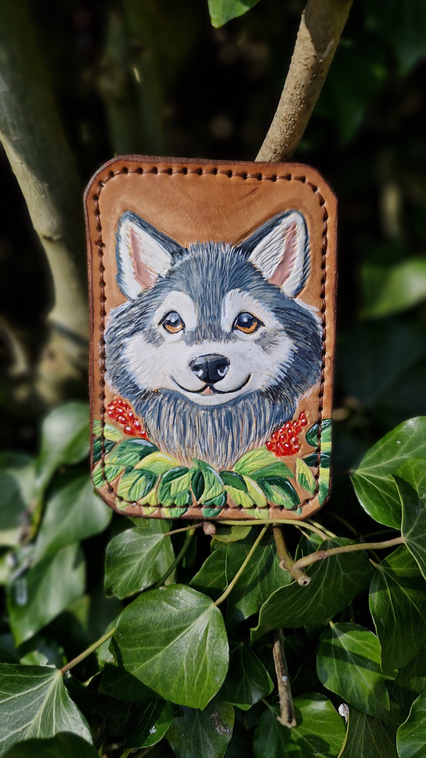 Sur la face avant, un louveteau entouré de feuilles et de petites baies apparaît dans la matière. Les détails sont d’abord sculptés et repoussés dans le cuir, puis peints à la main avant d’être protégés par un vernis résistant.