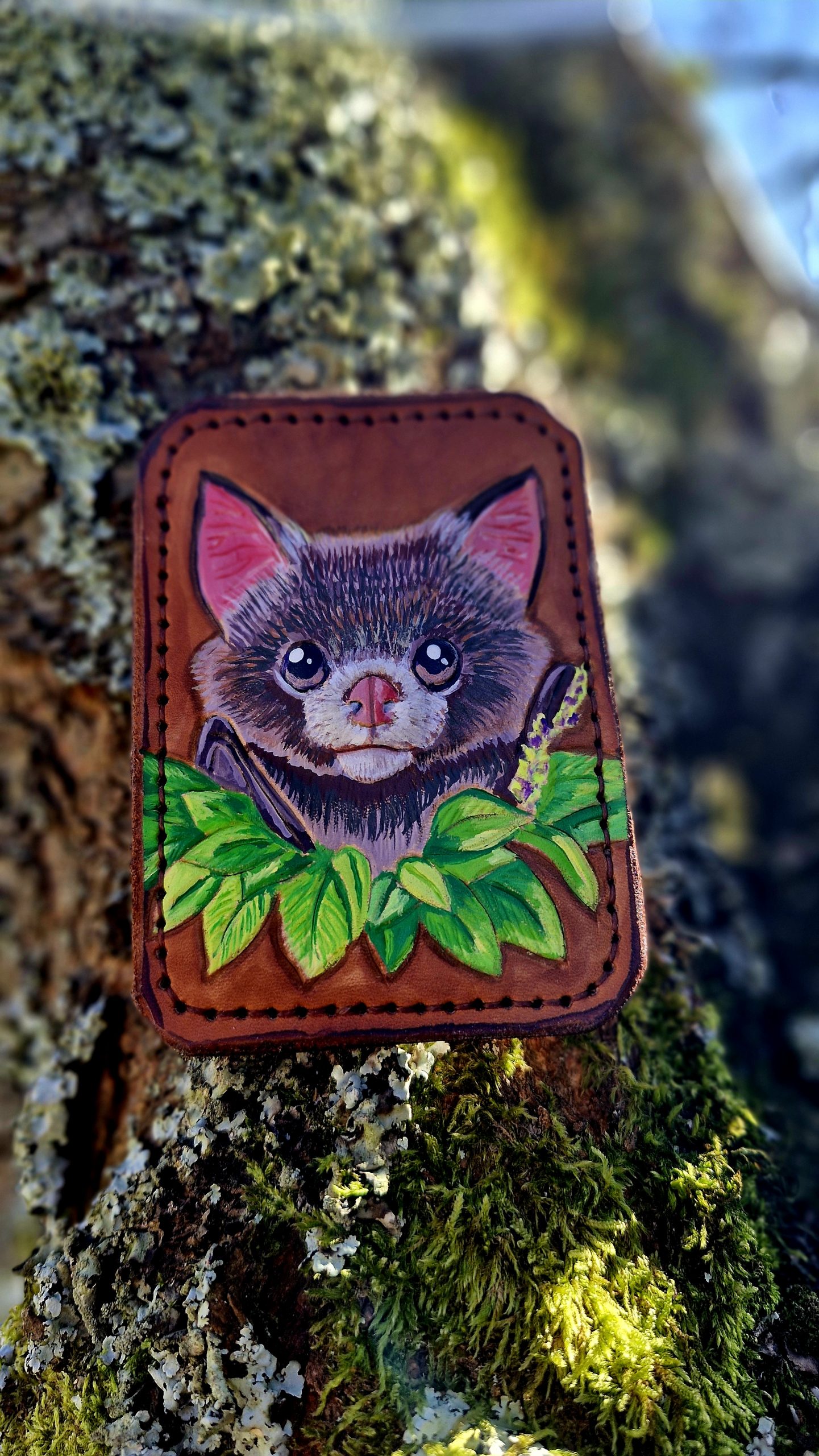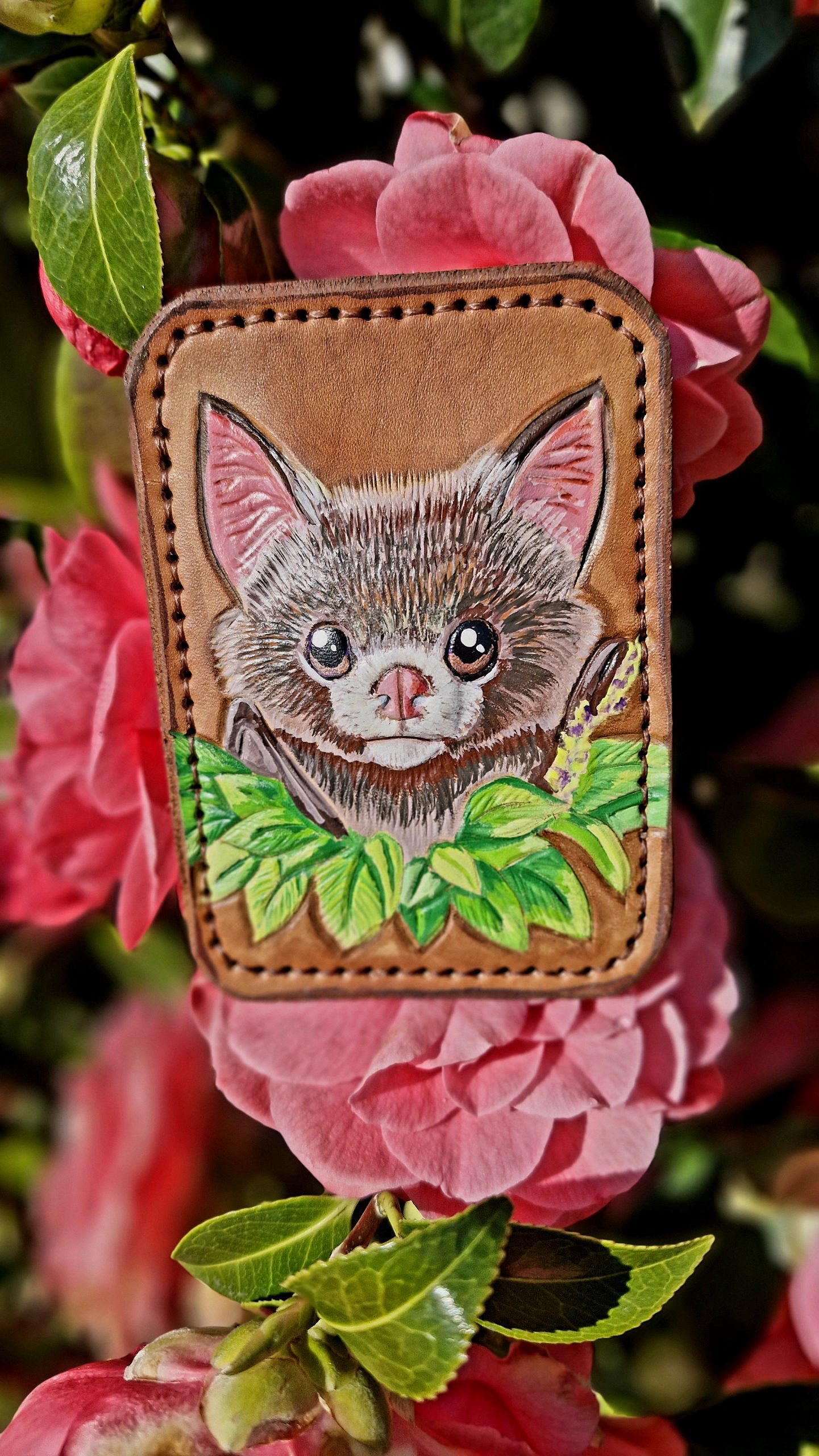 Sur la face avant, une chauve-souris entourée de feuillage apparaît dans la matière. Les détails sont d’abord sculptés et repoussés dans le cuir, puis peints à la main avant d’être protégés par un vernis solide.