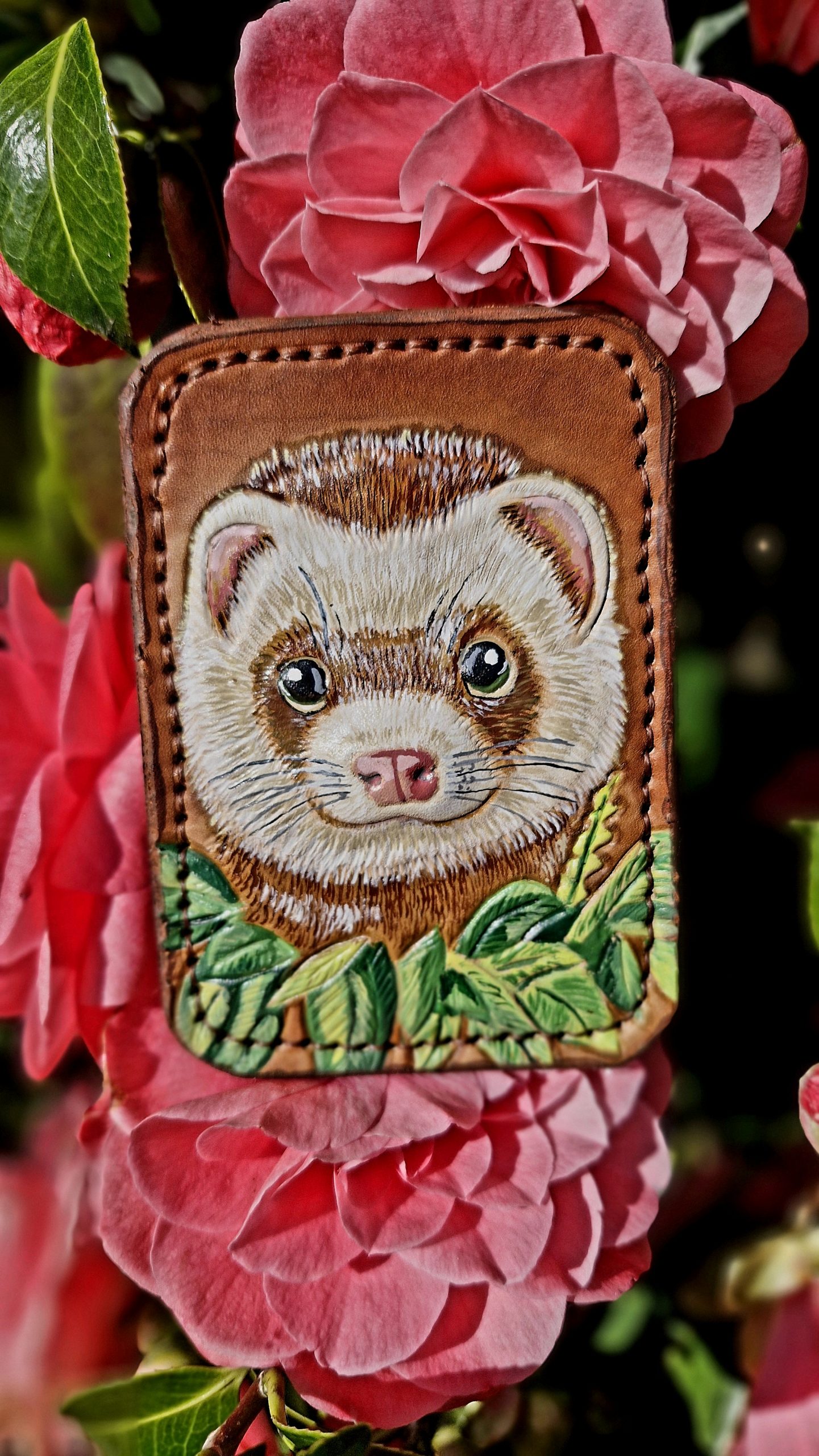 Sur la face avant, un furet entouré de feuilles apparaît dans la matière. Les détails sont d’abord sculptés et repoussés dans le cuir, puis peints à la main avant d’être protégés par un vernis résistant.