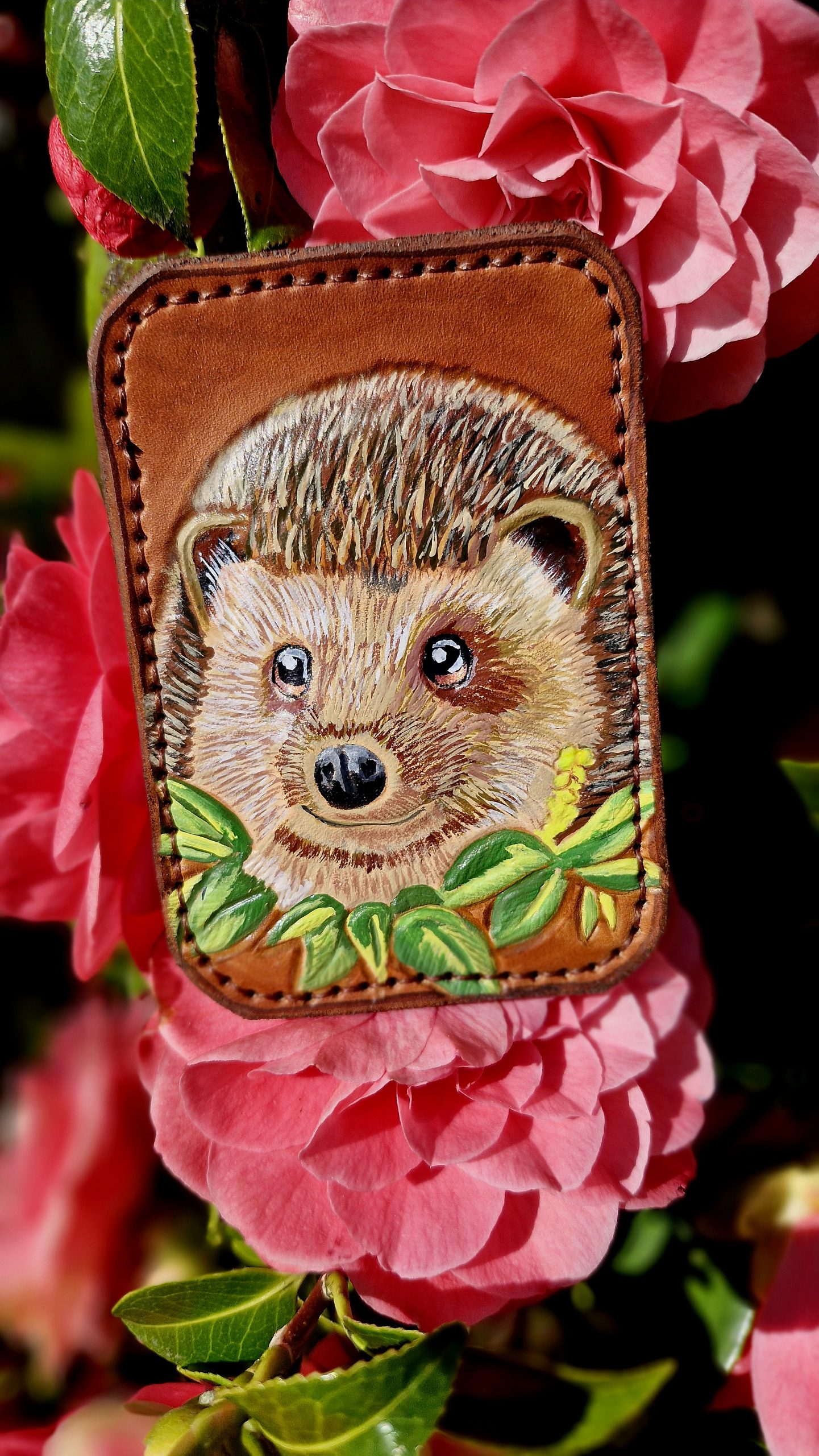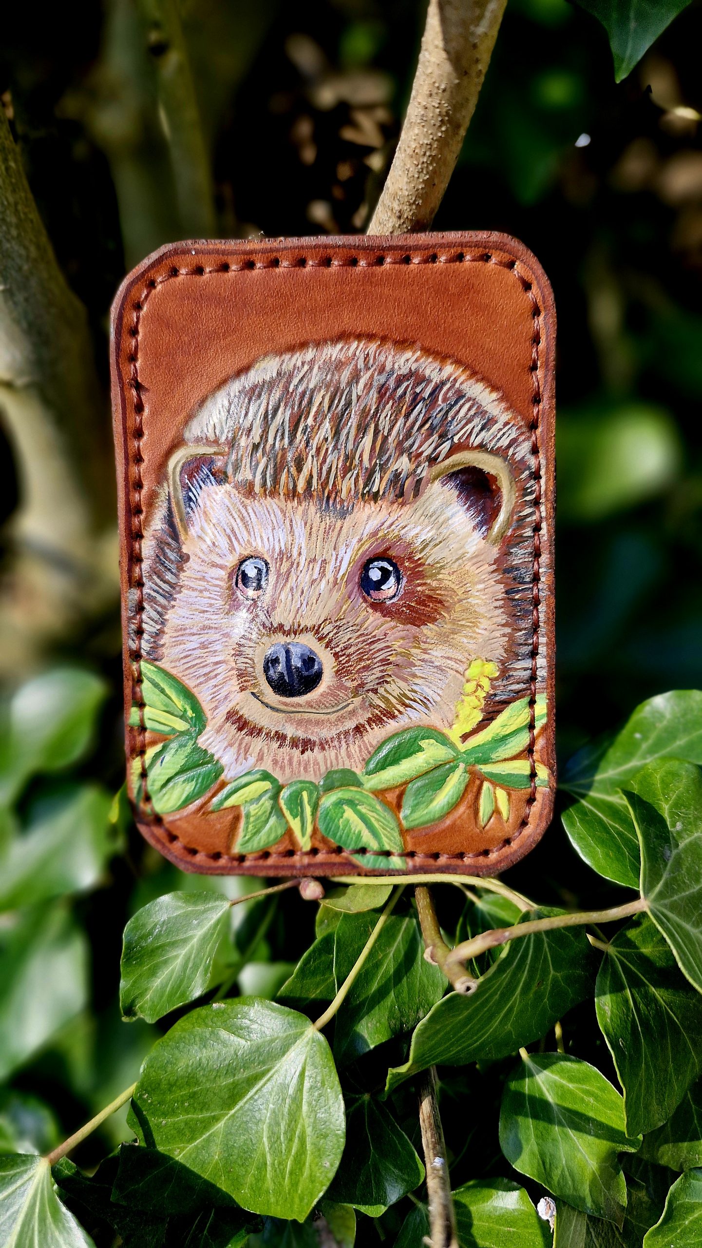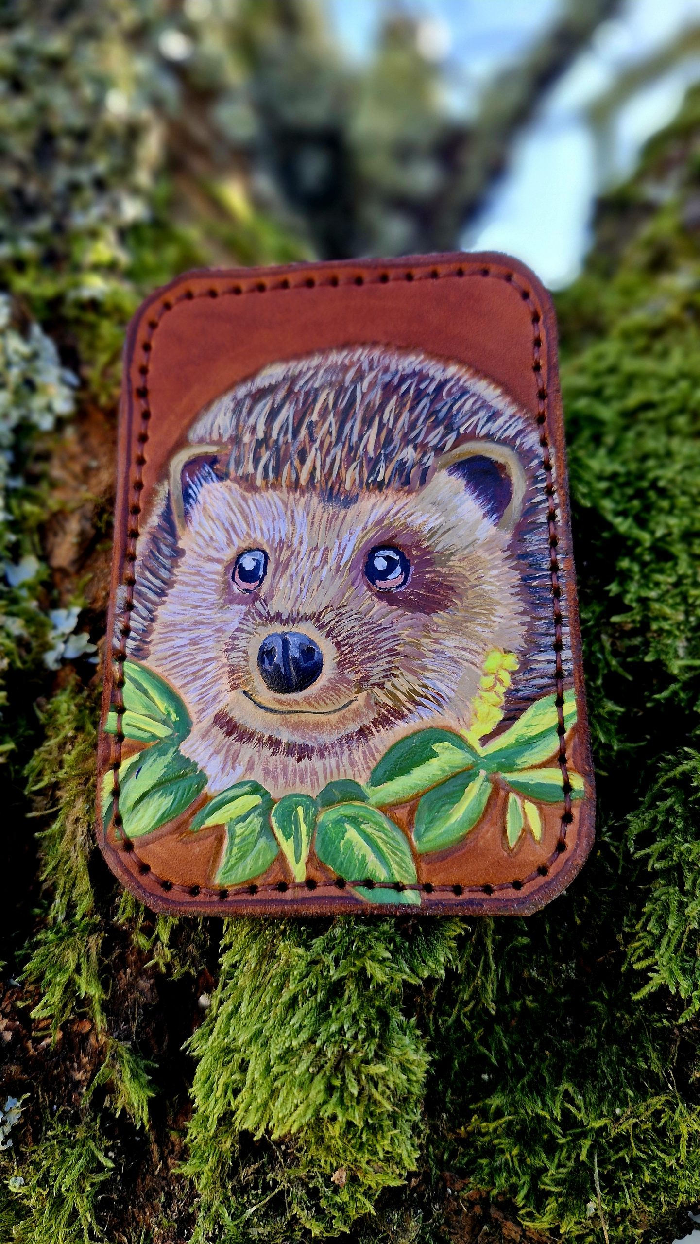 Sur la face avant, un hérisson entouré de feuilles apparaît dans la matière. Les détails sont d’abord sculptés et repoussés dans le cuir, puis peints à la main avant d’être protégés par un vernis solide.